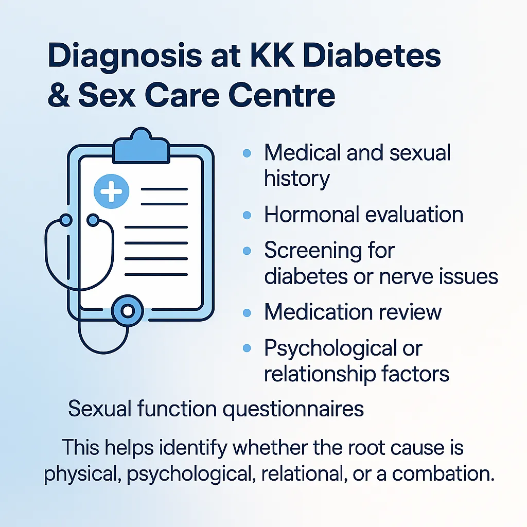 At KK Diabetes & Sex Care Centre, Coimbatore, we offer Orgasm & Climax Difficulty treatment confidential, evidence-based evaluation and treatment for orgasm and climax disorders in both men and women. With proper diagnosis and guidance, most patients experience significant improvement in sexual satisfaction, confidence, and intimacy.